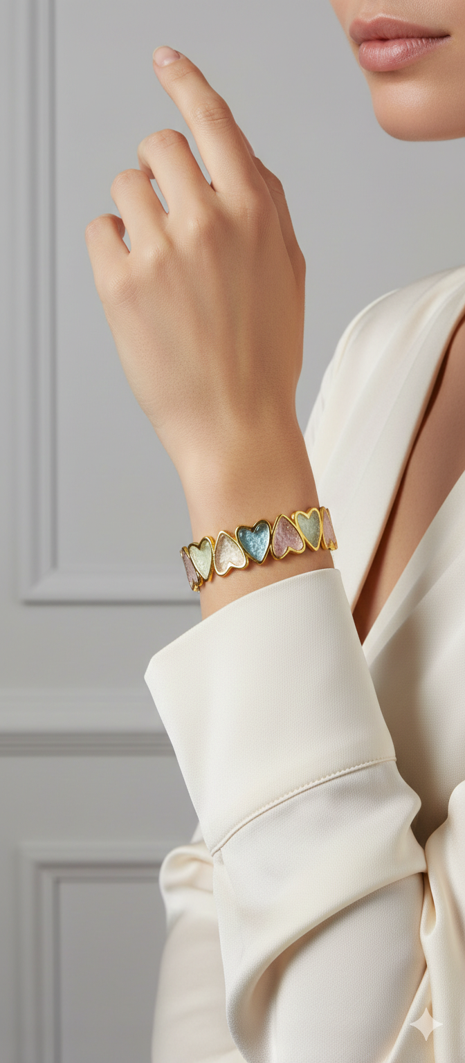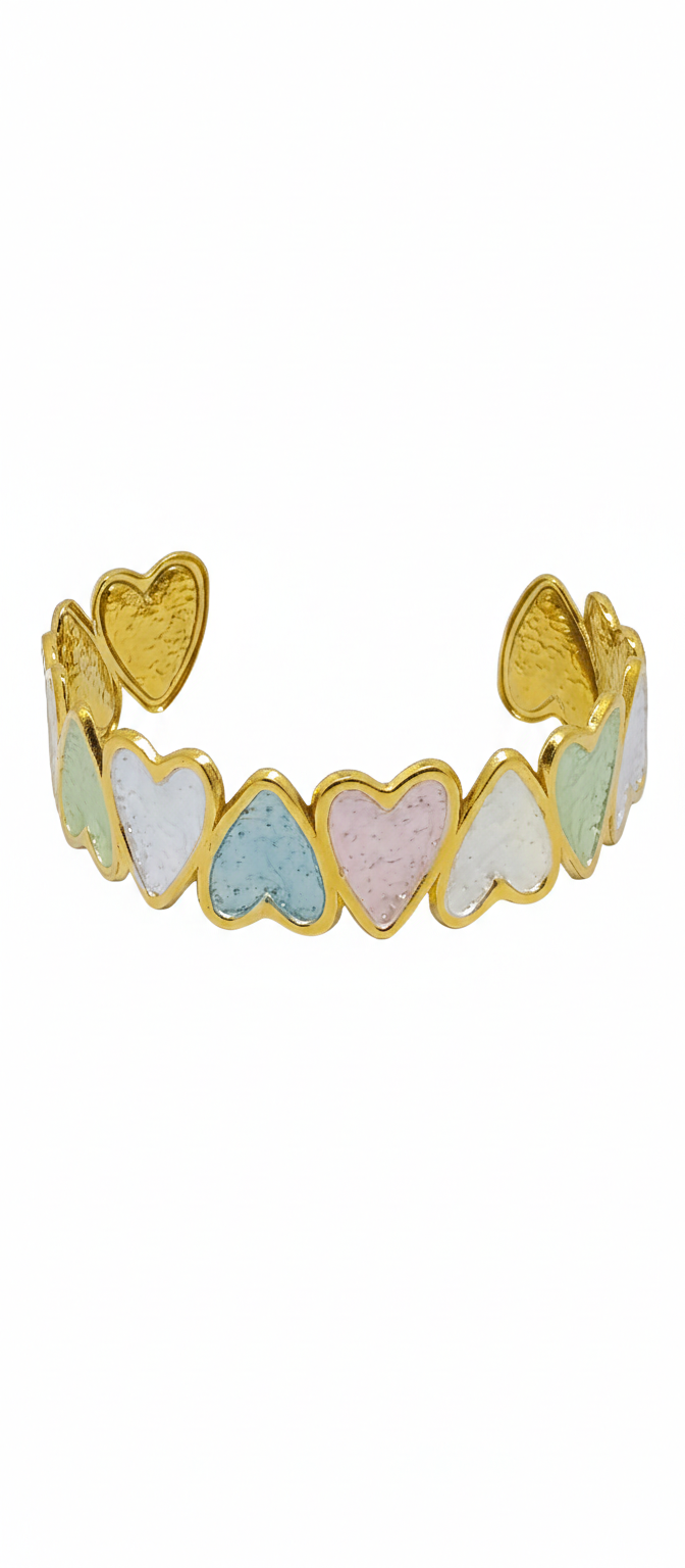 Brazalete Corazones Pastel en Acero Inoxidable Añade un toque romántico a tu muñeca con el brazalete Amour. Una pieza de acero inoxidable resistente al agua con corazones esmaltados en tonos pastel. Hipoalergénico, ajustable y diseñado para brillar siempre.