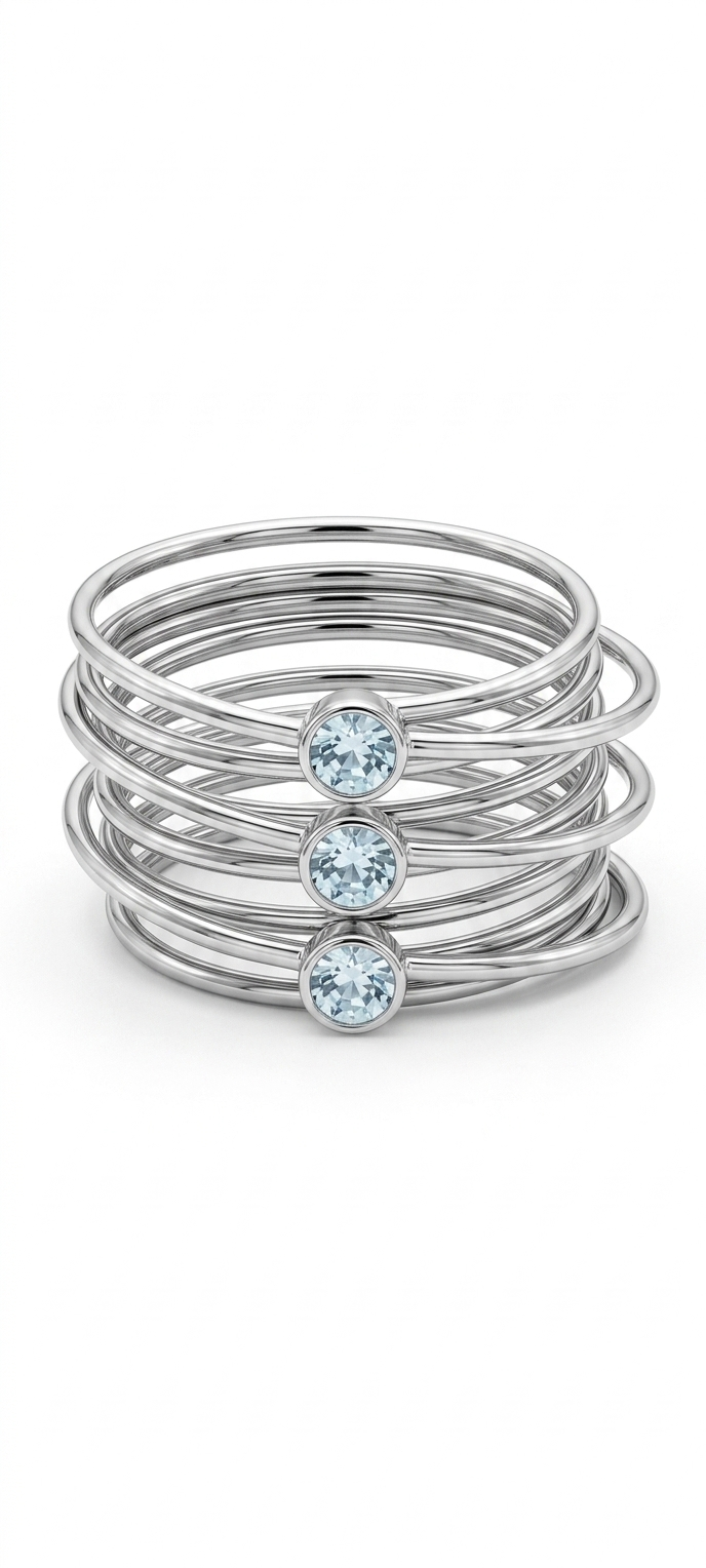 Detalle de Cristales: Presenta tres cristales centrales en un tono azul claro o aguamarina, engastados de forma individual. La disposición vertical de las gemas rompe la horizontalidad de las bandas, creando un punto focal moderno y refinado.