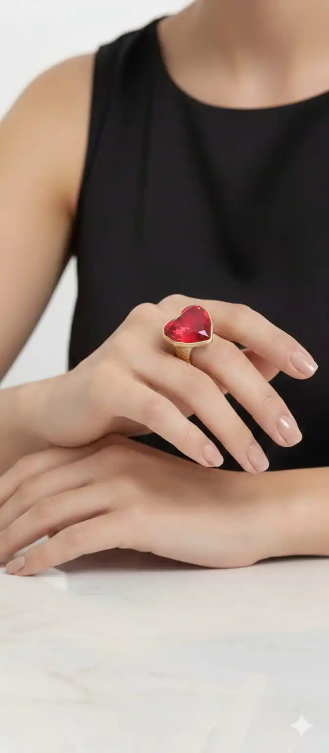 Este es un anillo con un diseño bold (llamativo) y romántico, que destaca por su gran tamaño y su vibrante color. Aquí tienes el detalle de sus características principales: