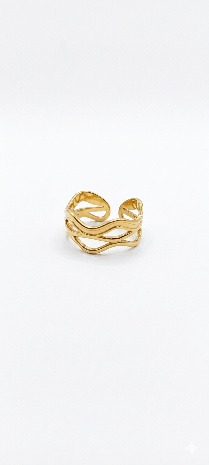 Inspirado en el movimiento fluido del mar, este anillo calado presenta líneas onduladas que se entrelazan armoniosamente. Una pieza de estilo orgánico y acabado brillante que aporta una sofisticación natural y artística a cualquier look.