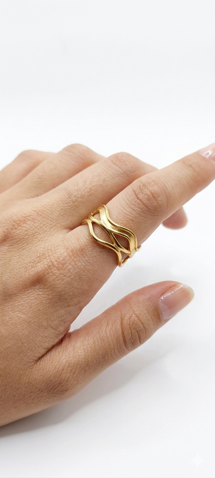 • Diseño Calado y Ondulado: La estructura se compone de líneas curvas que se entrelazan suavemente, creando espacios vacíos (calados) que aportan ligereza visual a pesar de ser un anillo ancho.