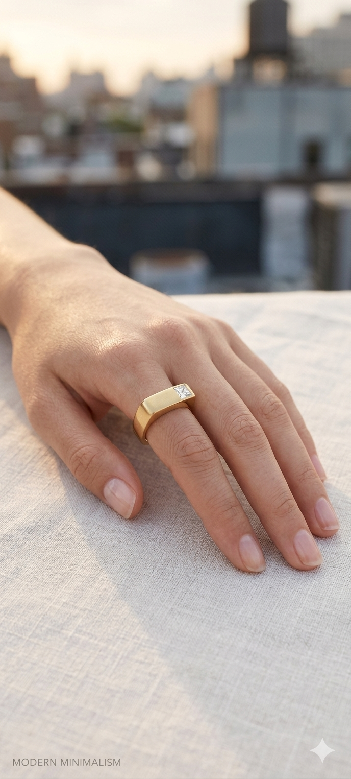 Perfil Plano: La banda es ancha y plana, lo que le da un aspecto robusto y arquitectónico, muy en sintonía con la joyería de autor contemporánea.