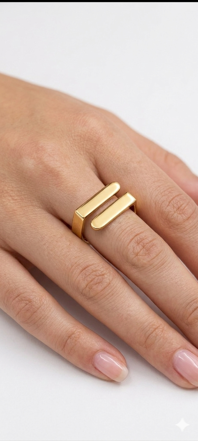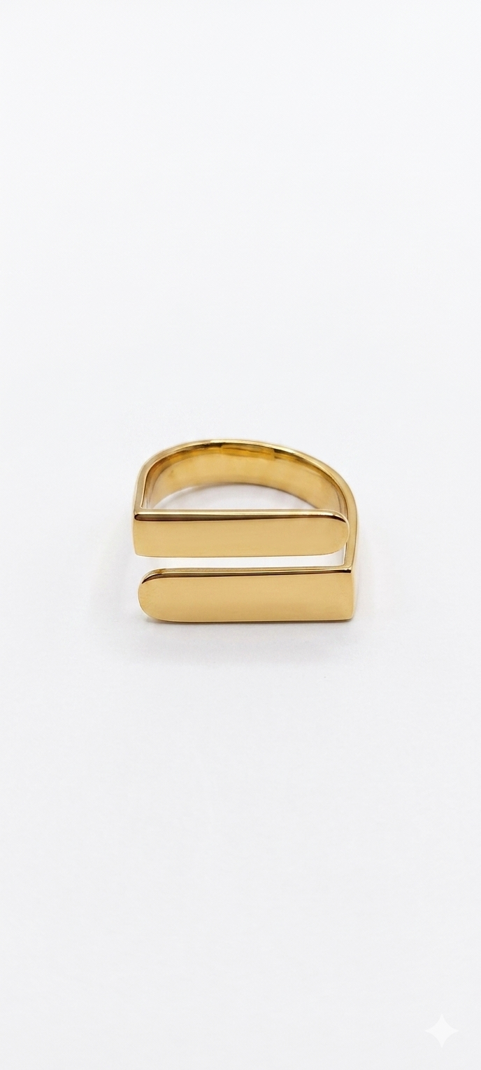 Este anillo destaca por un diseño minimalista y arquitectónico, ideal para quienes buscan una pieza moderna con un toque de sofisticación industrial.
