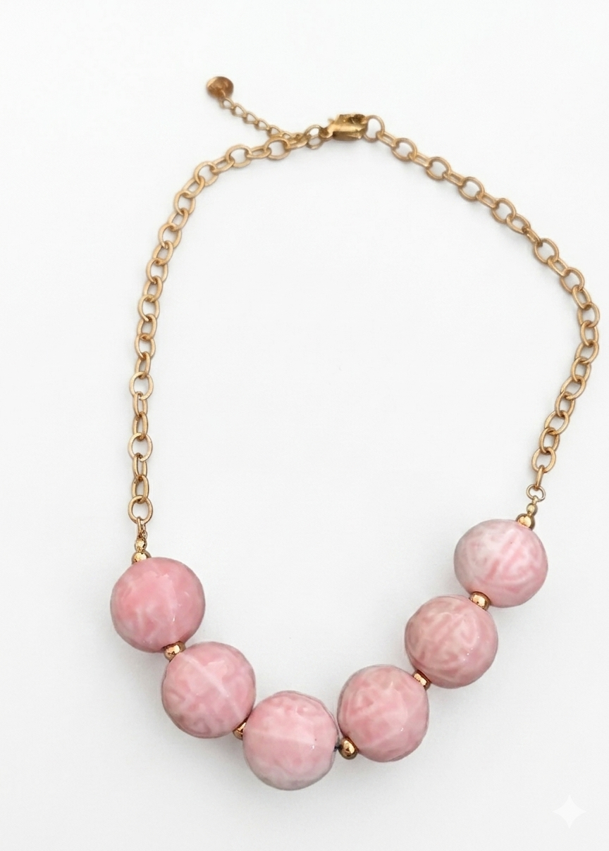 1. El Protagonismo de la Cerámica El alma del collar son sus seis maxicuentas de cerámica artesanal. A diferencia de las cuentas lisas, estas presentan un grabado en relieve que recuerda a los capiteles clásicos o a la erosión natural de las conchas marinas. Su color rosa cuarzo con acabado esmaltado capta la luz de forma distinta en cada ángulo.