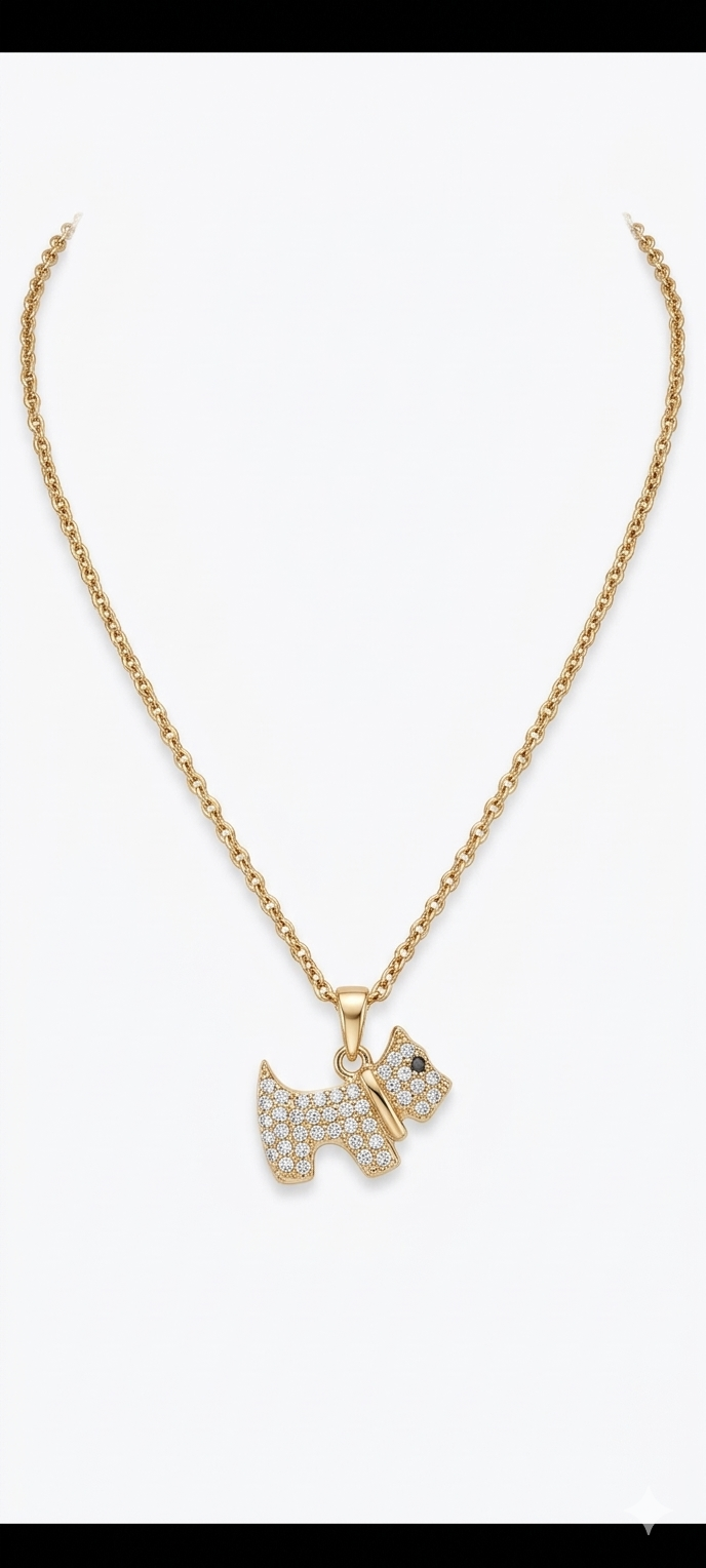 Dije (Pendiente): Tiene la silueta de un perro de raza Scottish Terrier (comúnmente asociado a marcas de lujo como Radley o Agatha). Está completamente pavonado con circonitas blancas (o cristales) que le aportan un brillo intenso y elegante. Un pequeño detalle destacable es el punto negro en el lugar del ojo, que le da definición al rostro del perrito.