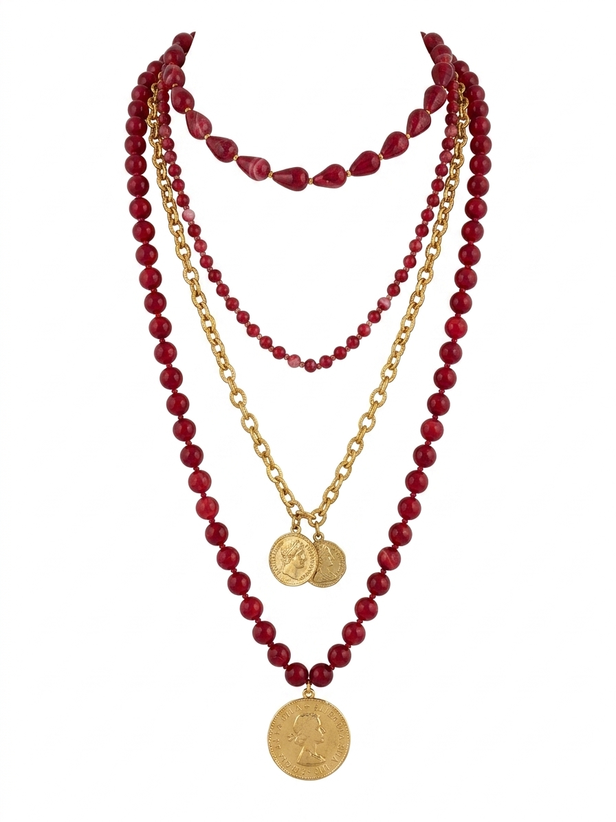 Este collar es una pieza multicapa de estilo bohemio y sofisticado, diseñada para crear un efecto visual de gran impacto mediante el uso de texturas y contrastes cromáticos entre el rojo intenso y el dorado
