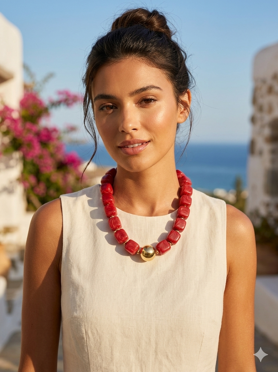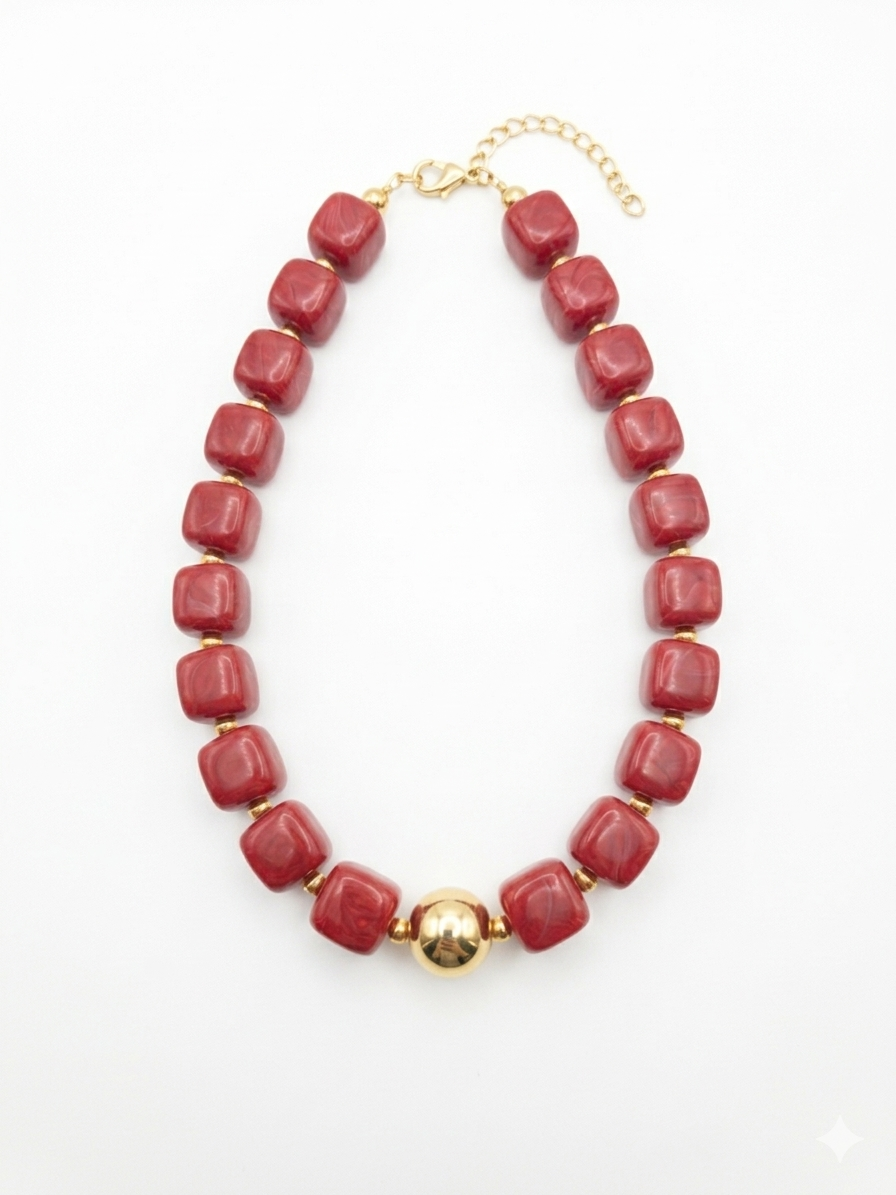 Este collar es una pieza de geometría audaz y contraste clásico, perfecta para quienes buscan un accesorio con fuerza y presencia. Su tono rojo intenso lo convierte en el protagonista indiscutible de cualquier look de catálogo.