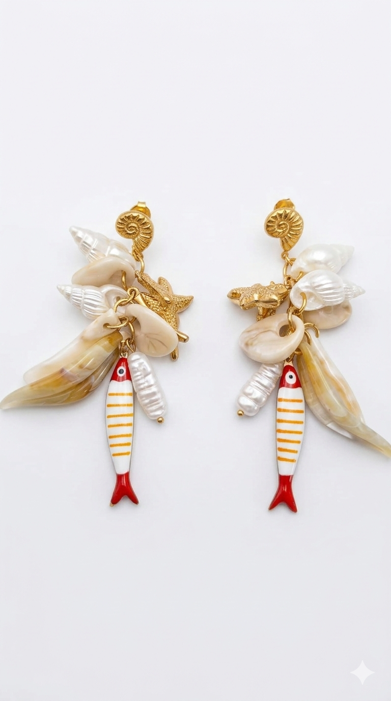 Estos pendientes presentan un diseño ecléctico y maximalista de inspiración marina, perfectos para un look de verano con personalidad. Se caracterizan por su estructura de cascada de amuletos (charms) que cuelgan de una base metálica dorada.