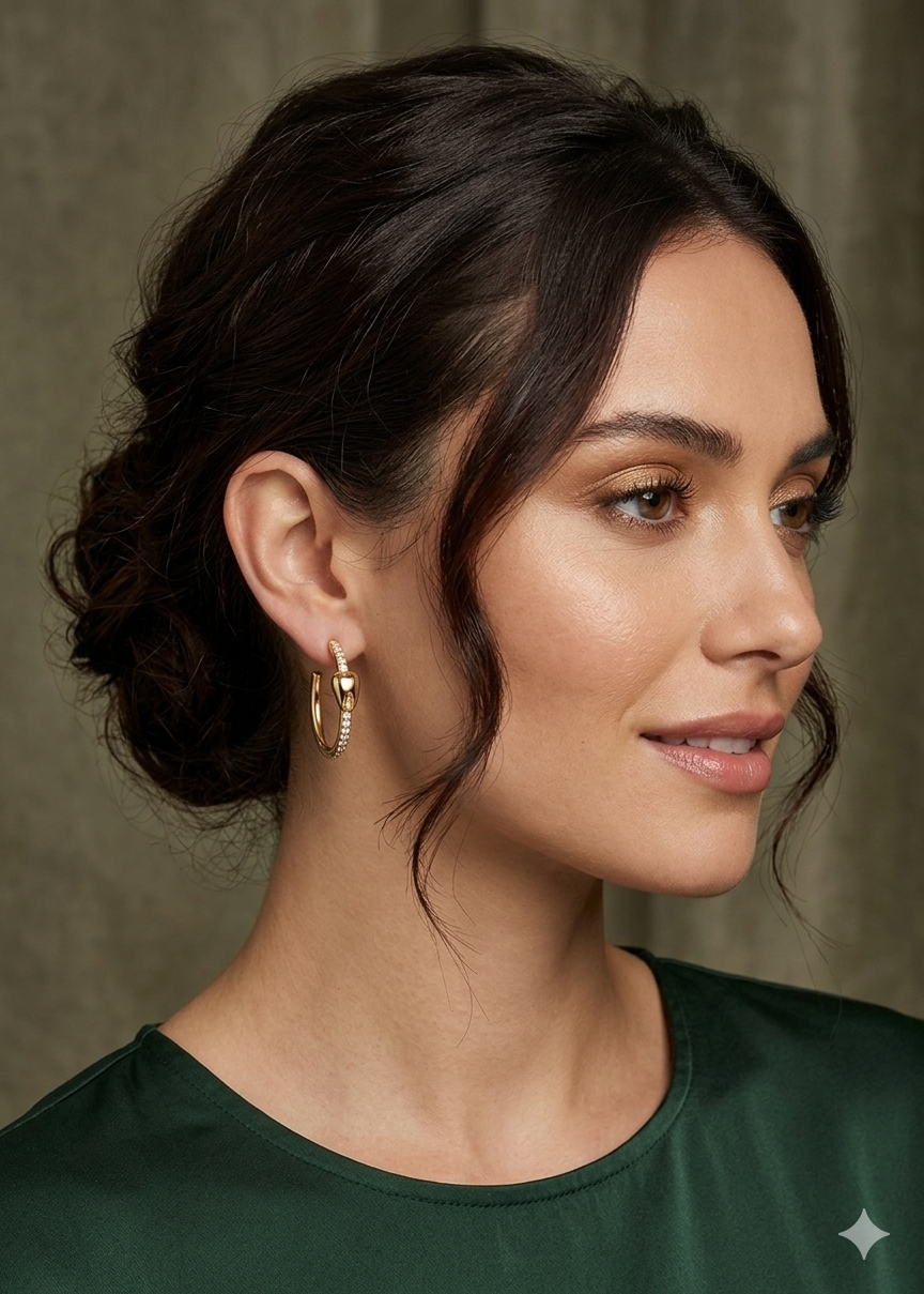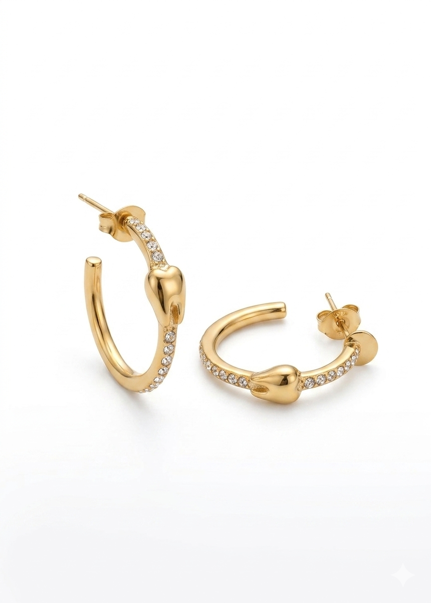Son unos pendientes de estilo aro pequeño o «huggie», elaborados en acero amarillo con un acabado pulido y brillante.