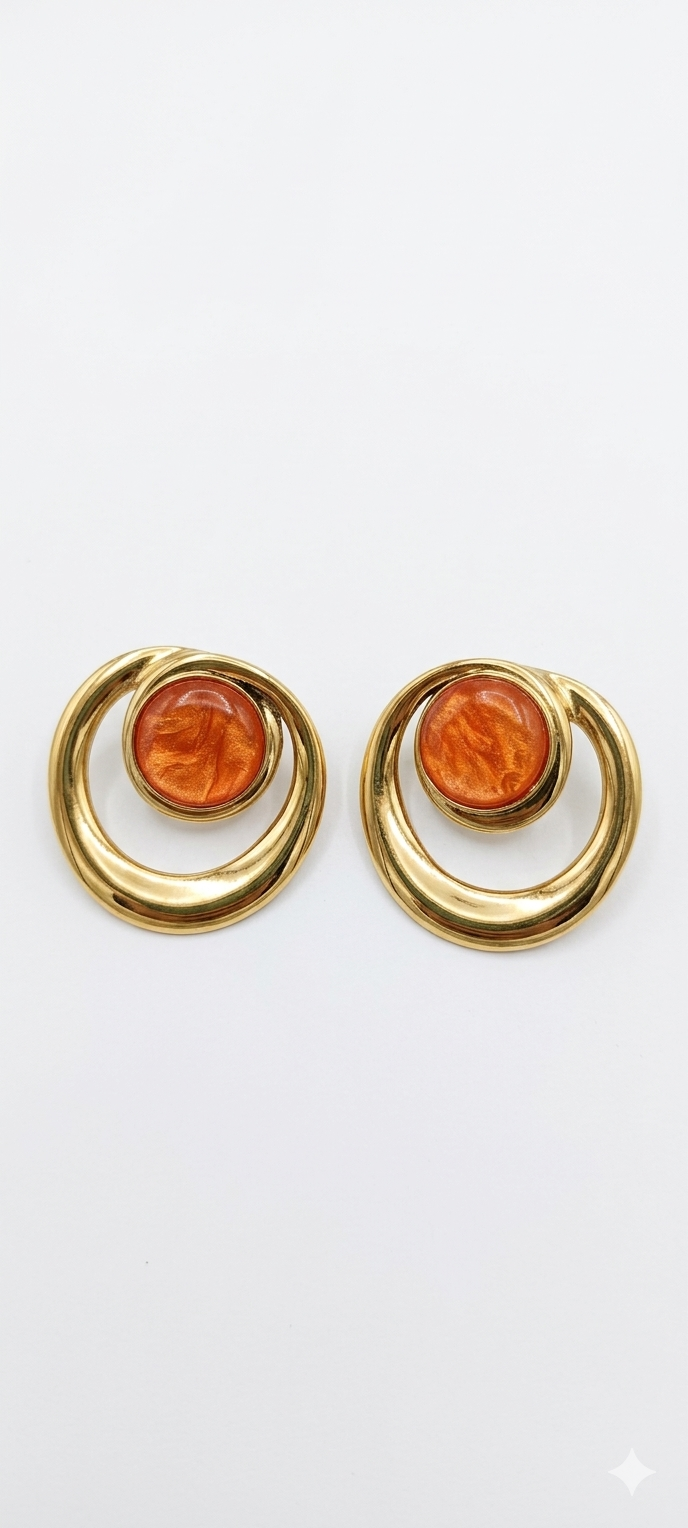 Detalle Central: El corazón de la pieza es un cabujón circular de resina nacarada en un tono naranja vibrante (ámbar/terracota). El acabado interno de la resina tiene un efecto marmoleado o «swirl» que captura la luz, creando profundidad y diferentes matices de color.
