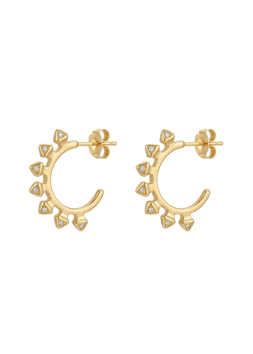 Aros Abiertos (C-Hoops): Estos pendientes son aros dorados que no forman un círculo completo. Tienen una forma de «C» que se sujeta a la oreja mediante un pasador y una tuerca de mariposa (cierre de presión), visibles en la parte trasera.