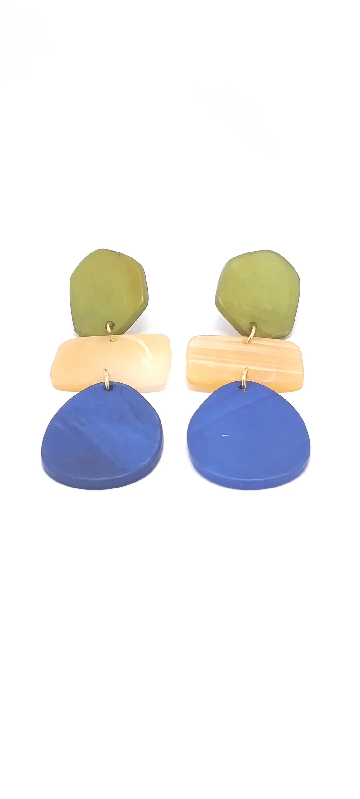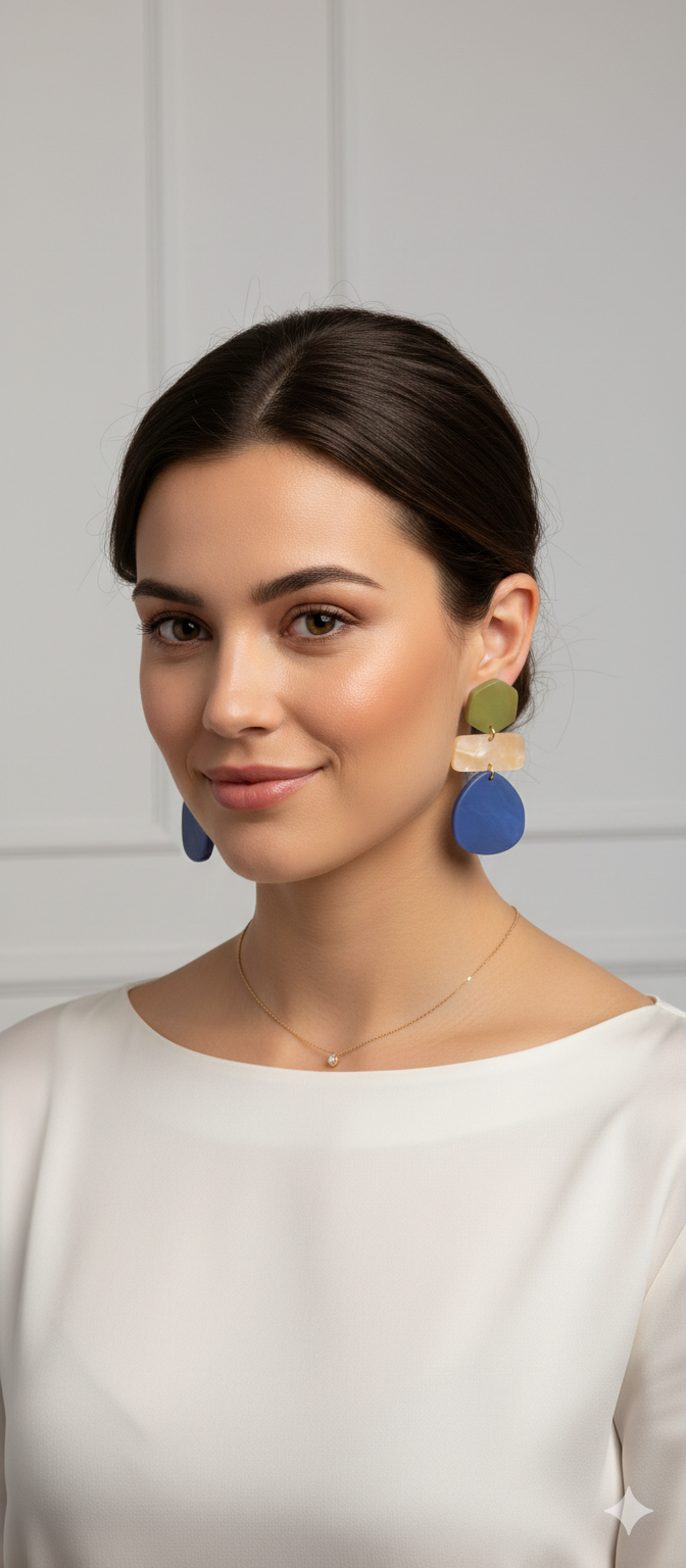 Pendientes Trío de Color Dale vida a tu rostro con esta pieza de diseño orgánico. El contraste entre sus formas geométricas y sus tonos vibrantes los convierte en el accesorio perfecto para transformar un look básico en uno extraordinario.
