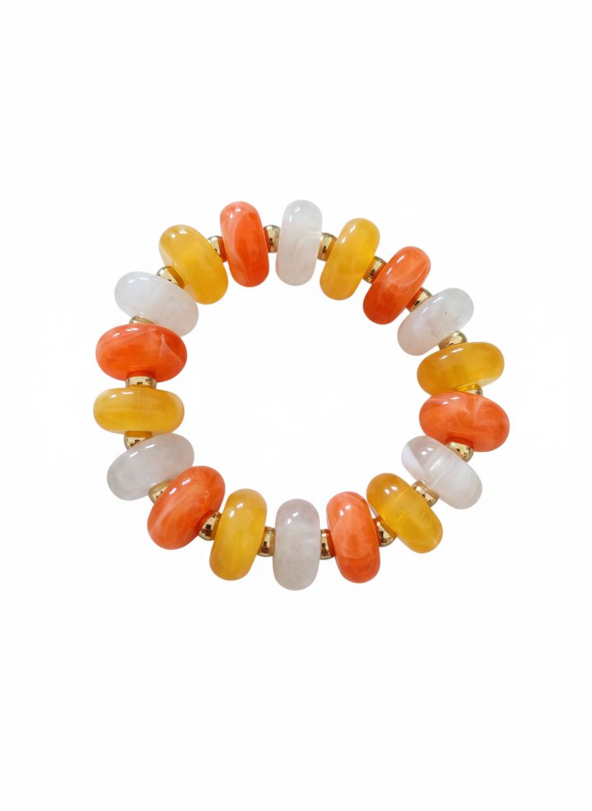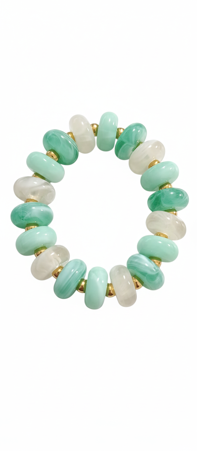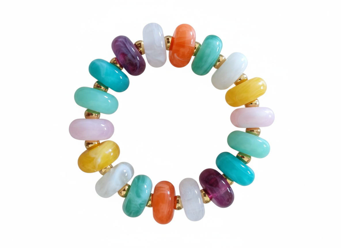 Materiales: Las cuentas de resina imitan la apariencia de piedras semipreciosas por su ligereza y colorido. Están intercaladas con delicados espaciadores de acero con baño de oro, que aportan un toque de brillo metálico y aseguran la durabilidad de la pieza.