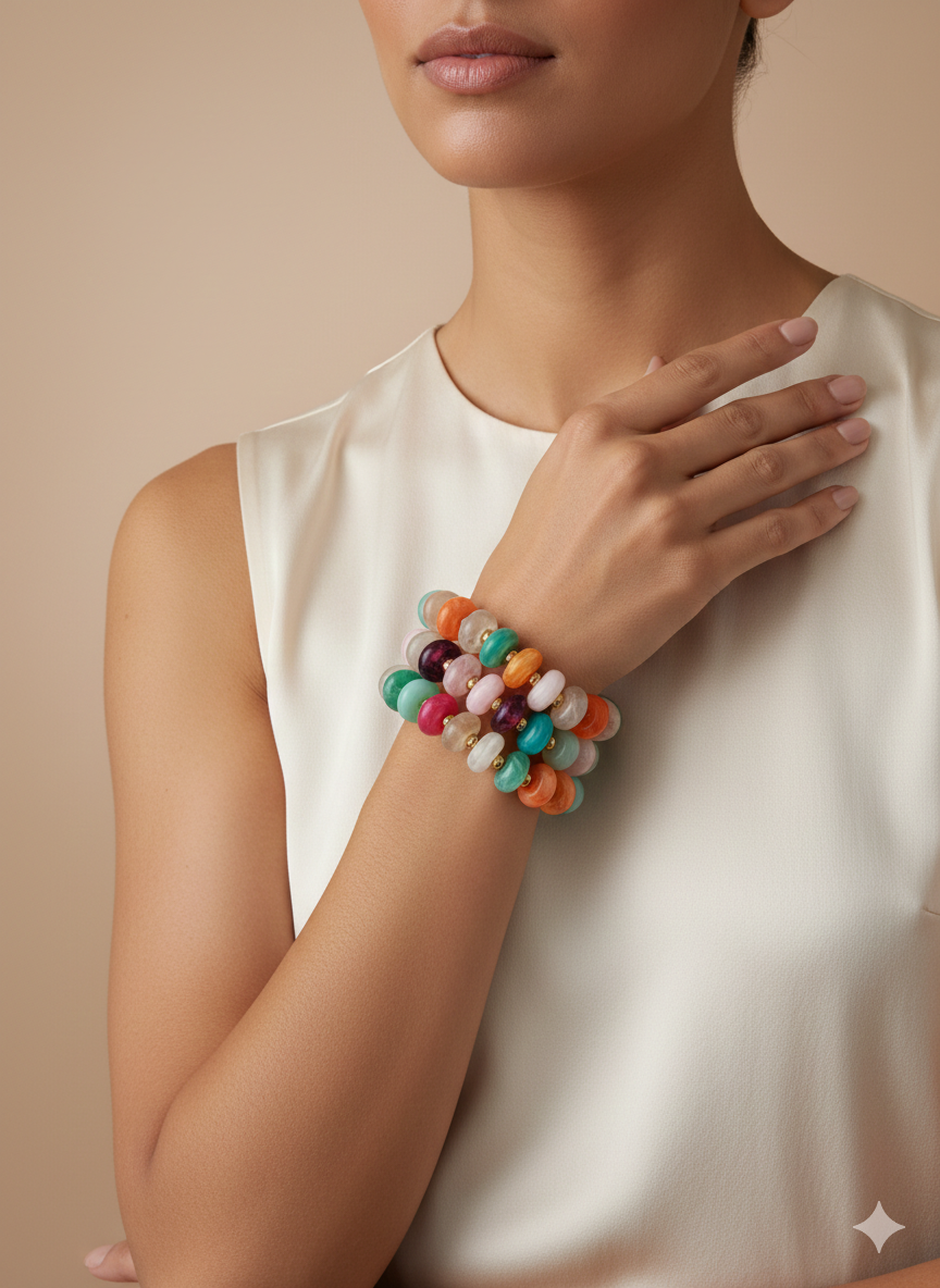 Esta pulsera es una pieza de joyería contemporánea que destaca por su vibrante juego de colores y su diseño táctil. Aquí tienes una descripción detallada enfocada para un catálogo profesional: