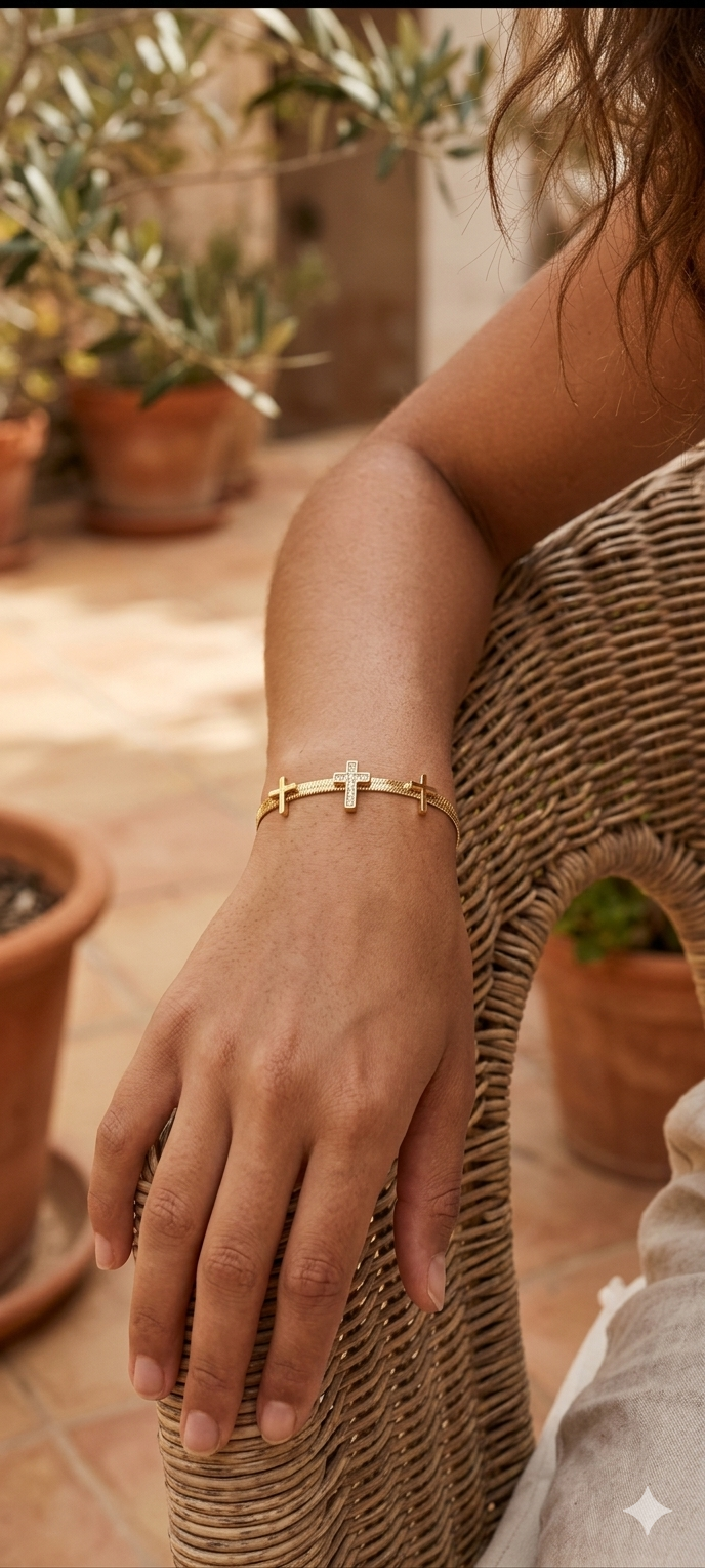 «Una pieza que fusiona la protección y la moda. Su cadena plana le da un aire ‘retro-chic’ muy actual, mientras que las cruces añaden un toque personal. Es ideal para llevarla sola como protagonista o combinarla con relojes y otras cadenas finas.»
