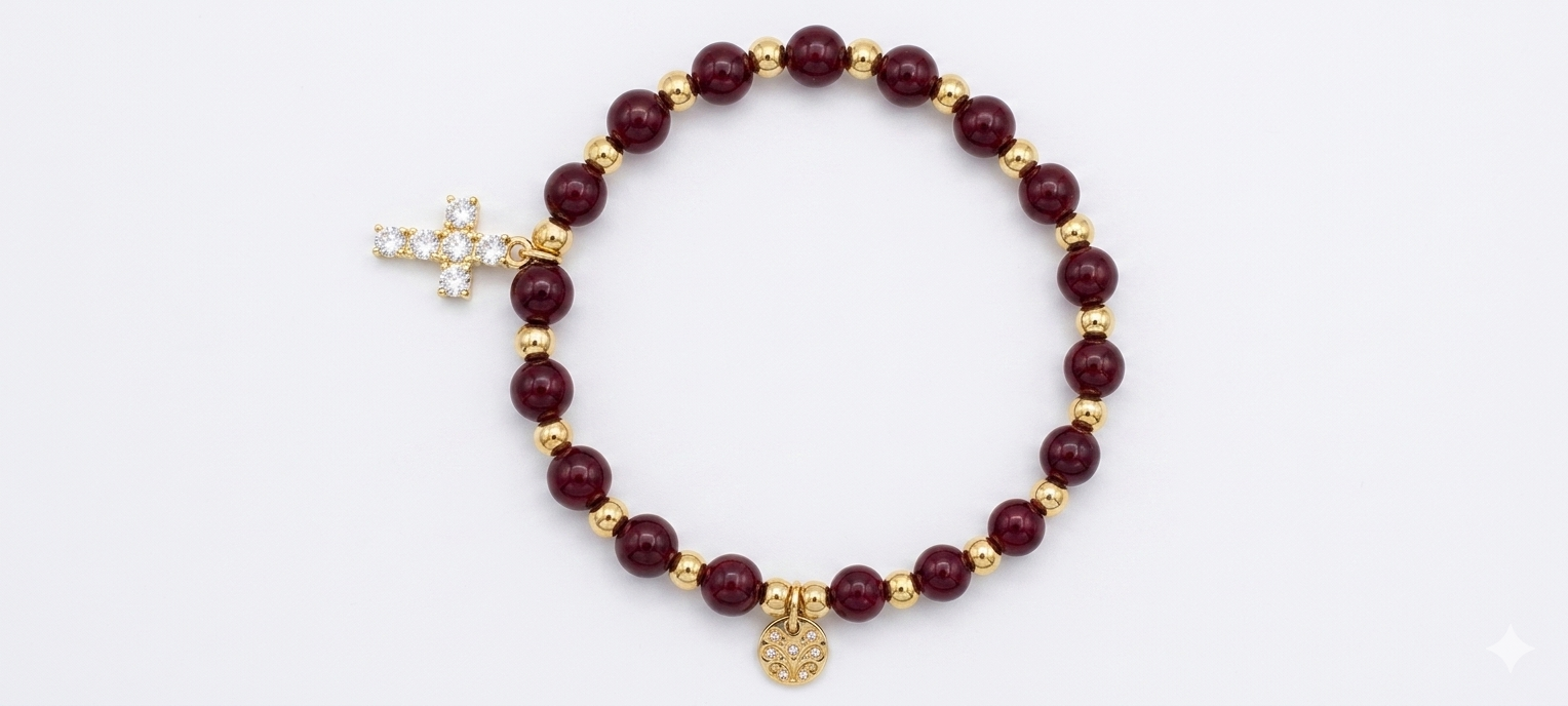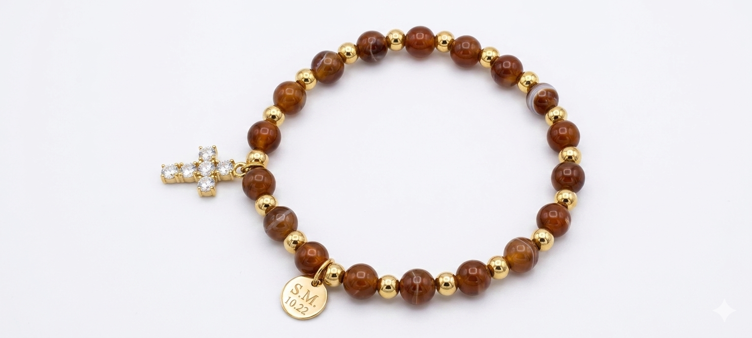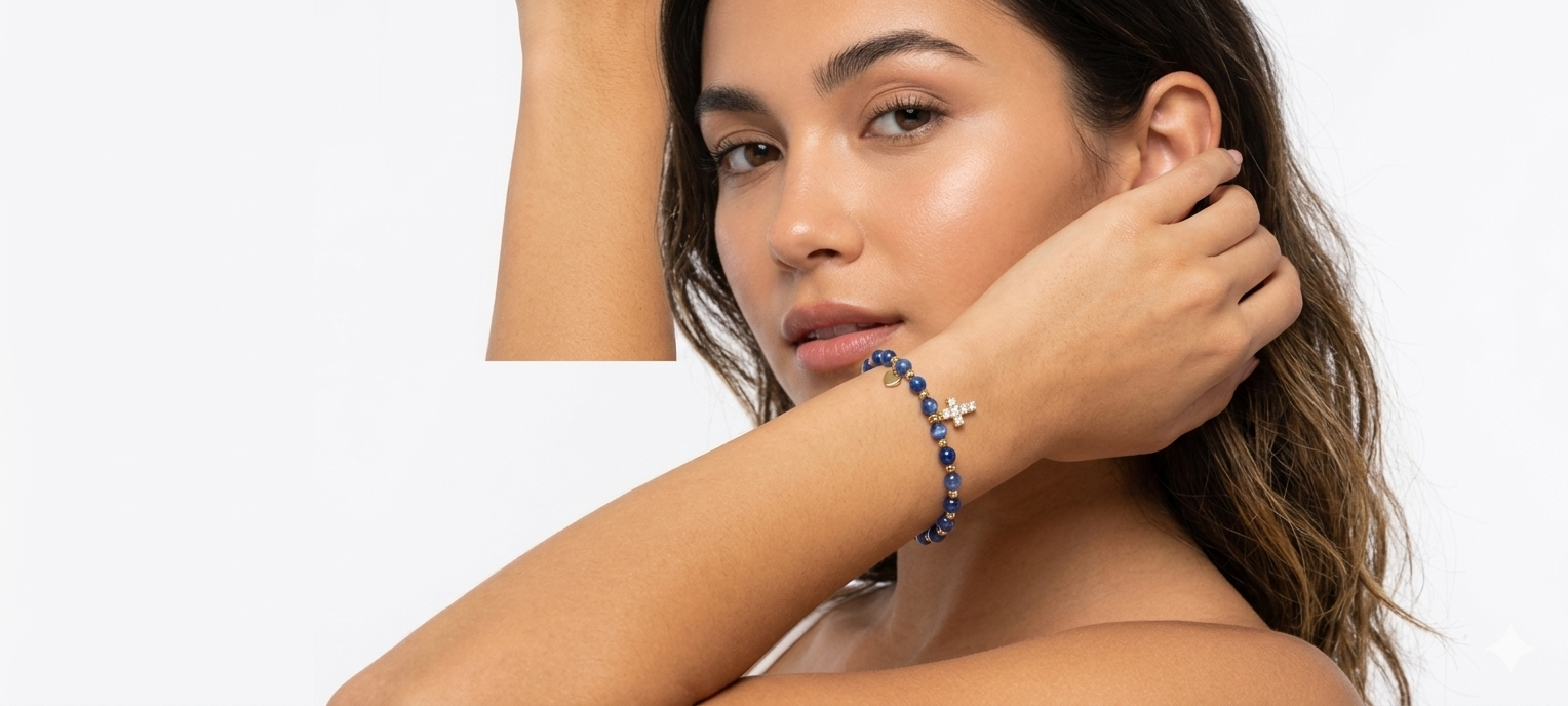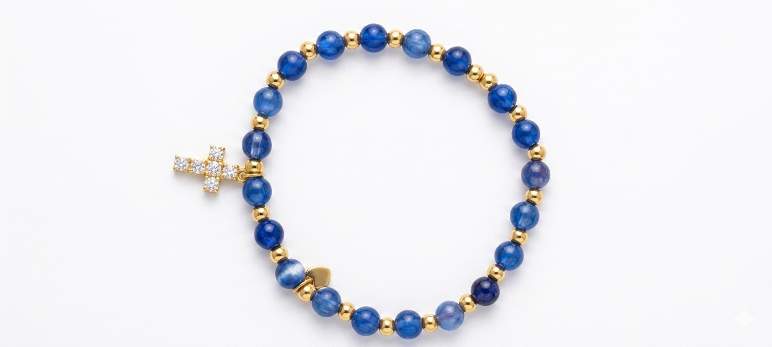 Esta pulsera es una pieza de joyería de diseño exquisito, perfecta para cualquier ocasión. Está elaborada con cuentas redondas de cianita azul, que se dice que tienen propiedades calmantes y equilibrantes. La pulsera se complementa con cuentas de color dorado pulido, que añaden un toque de elegancia y sofisticación. Una pequeña cruz de color dorado con cristales incrustados cuelga de la pulsera, simbolizando la fe y la protección. Además, un pequeño colgante en forma de corazón de color dorado completa la pieza, dándole un toque de romanticismo. La pulsera está disponible en diferentes tamaños para adaptarse a todas las muñecas.
