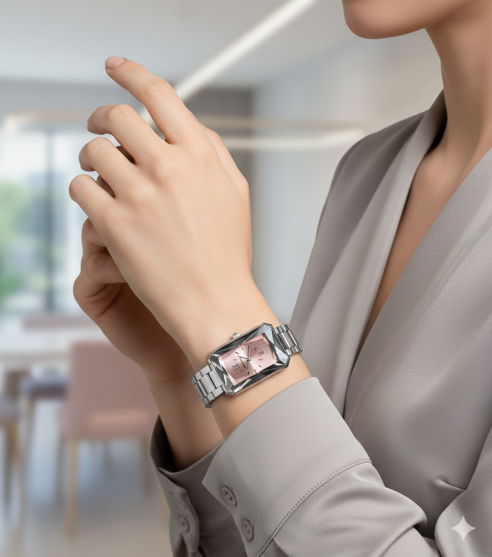 Esfera Rosa Metalizada: El dial presenta un tono rosa cuarzo con acabado satinado. Su limpieza visual, con índices minimalistas y agujas finas, permite que el protagonismo se lo lleve el juego de luces del cristal facetado.