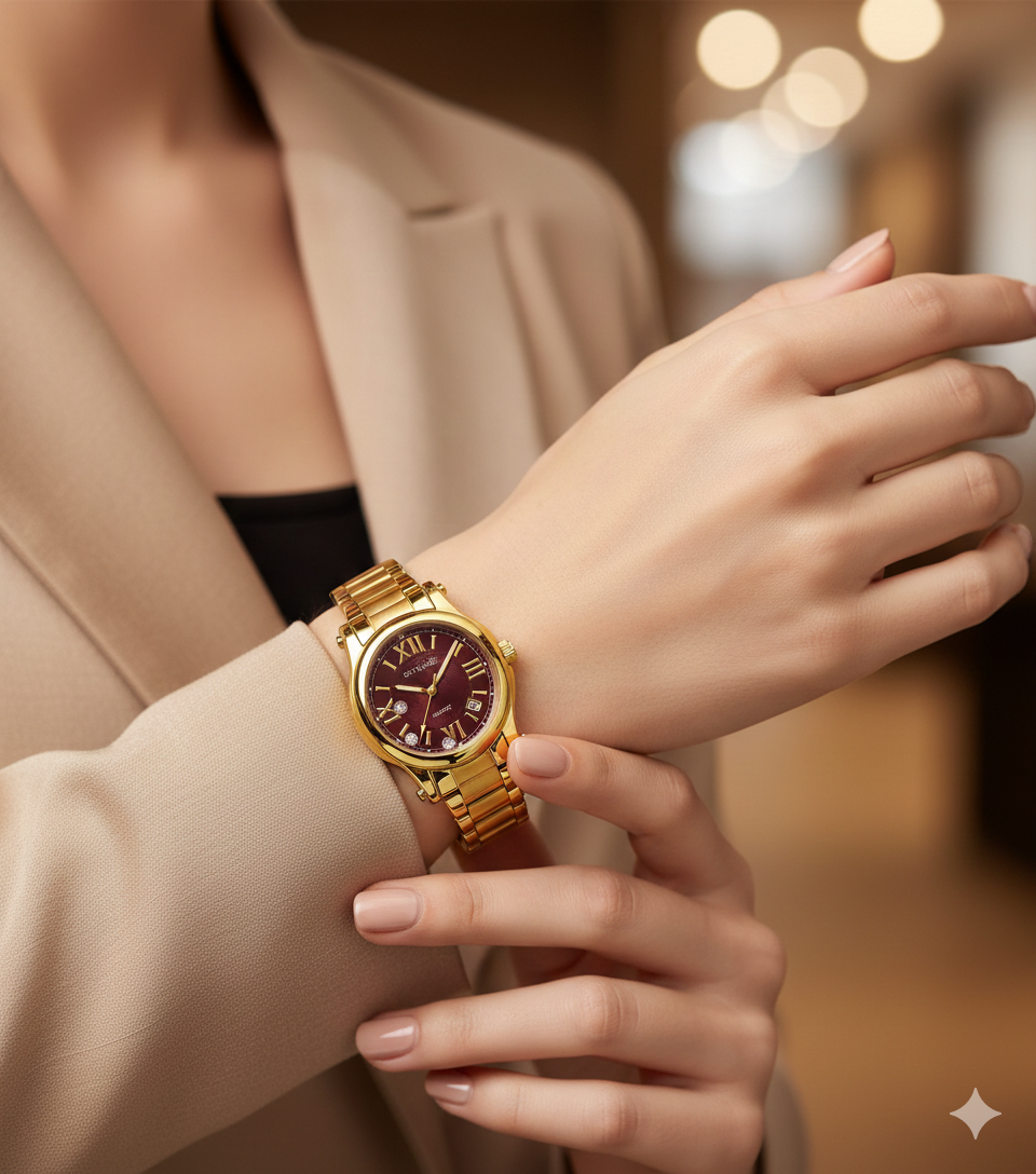 Esfera Borgoña Profundo: El dial destaca por un tono vino/borgoña intenso con un acabado soleil que crea reflejos hipnotizantes. Este color no solo es sinónimo de elegancia, sino que ofrece un contraste extraordinario con el oro.